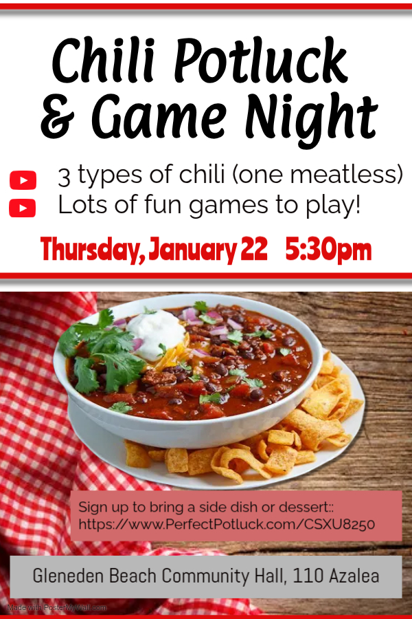 Thursday, January 22, at 5:30pm we’re kicking off this year’s Game Night with a Chili Potluck. There will be three different types of chili provided, including a meatless version, plus shredded cheese and onion toppers. Just click on the link below to sign up for the side dish you’d like to bring, and if you can help with set-up or clean-up, let us know on the form as well.