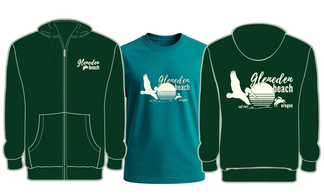 The new 2026 Gleneden Beach T-shirts and sweatshirts will be on sale at the April 5 pancake breakfast! There are four styles–hoodie, full-zip hoodie, and short- and long-sleeve T-shirts. The hoodies are forest green, and the T-shirts are blue-green this year. The artwork was done by our talented local artist and club member Marta West. You can get a sneak preview by clicking on the attached artist proof.